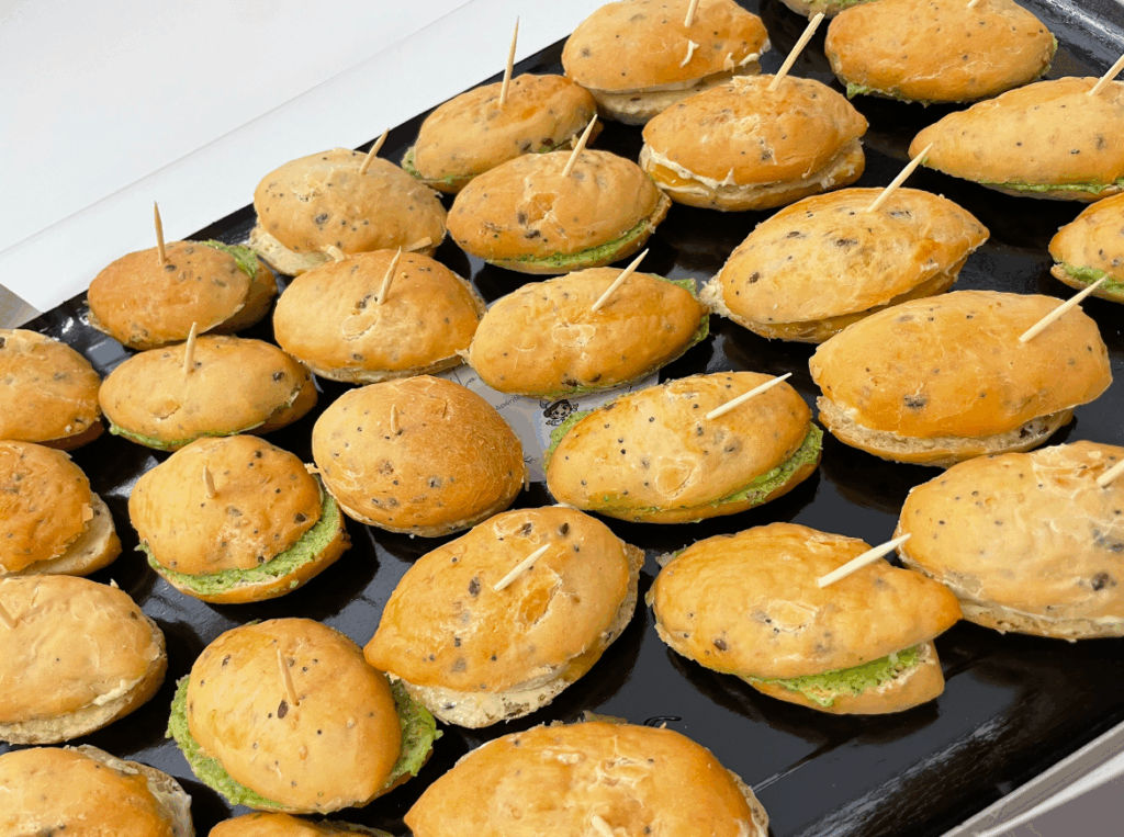 - 5 mini sandwichs d’une variété au choix (poulet, thon, saumon, jambon cru ou jambon blanc)