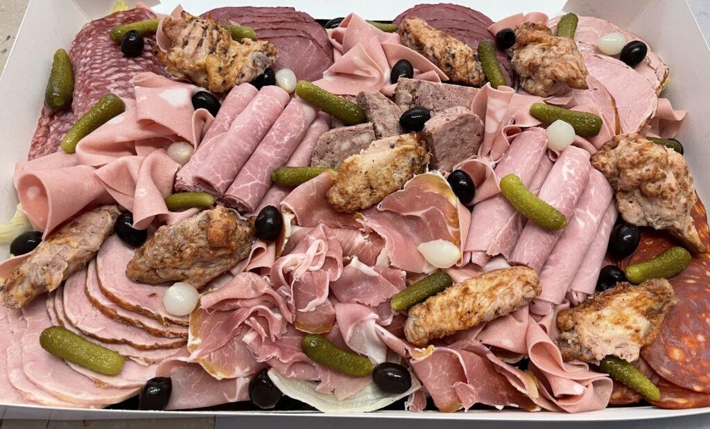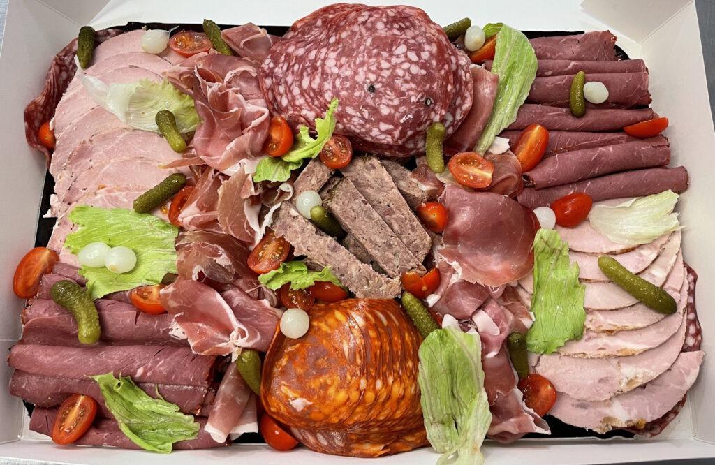 Composé de jambon de Bayonne, coppa, rosette, chorizo, comté, camembert, chèvre, roquefort, bâtonnets de carottes, tomates cerises, bâtonnets de concombre, radis, sauce cocktail et sauce tartare.